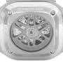 Pouzdro: Čtvercové pouzdro z nerezové oceli 41,0 x 41,0 mm. Průhledné safírové sklo na zadní straně s vyvažovacím závažím. Dvě tlačítka ovládají funkce chronografu. Logo Bell & Ross na korunce.
