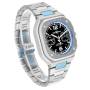 Ciferník: Černý ciferník se svítícími tyčkovými ručičkami a indexy. Vystouplá svítící arabská čísla na 6 a 12 hodinách. Okénko data mezi 4 a 5 hodinami. Tachymetrická stupnice v modré barvě podél rehautu.